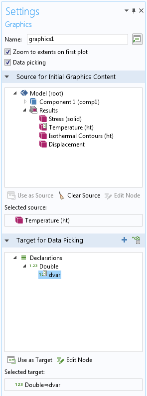The result of the pick operation can either be stored in a double array declaration (to retrieve coordinates), a double declaration (to retrieve evaluated results in a plot), in a point probe node (to let the user choose the position of probes), or in the new Graphics Data declaration. This last choice is a custom declaration for data picking in plots and geometries. With that declaration, you can retrieve both coordinates and evaluated data, as well as create form objects that help the app user pick points in domains in 3D.