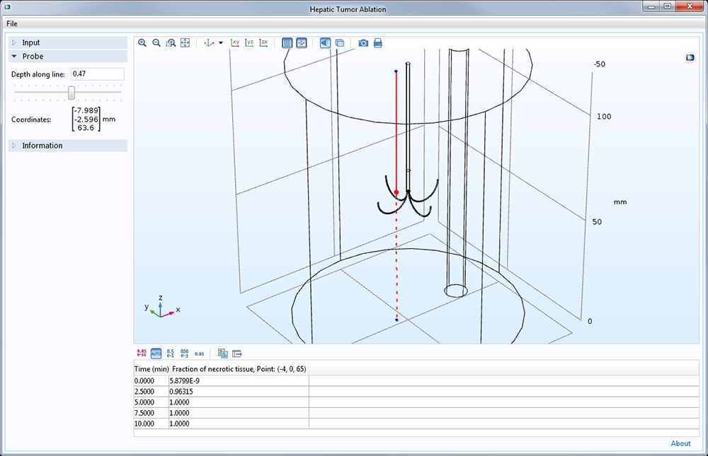 An app where the user can define the position of a probe in the Probe section. Data from this probe point will then be stored while computing the solution and displayed in the table toward the bottom. In the example, this is the fraction of necrotic tissue over time from an app simulating tumor ablation.