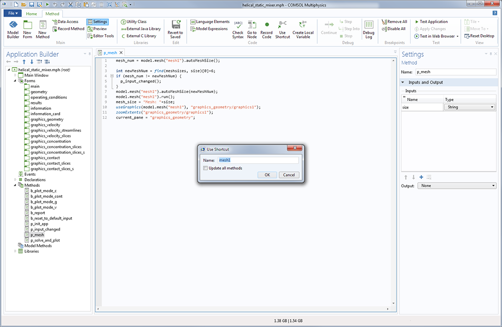 To create a shortcut to the method that controls the mesh operation, first place the cursor inside the "mesh1" custom name in the method code and then select the Use Shortcut button from the ribbon.