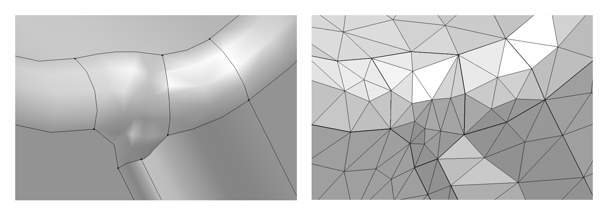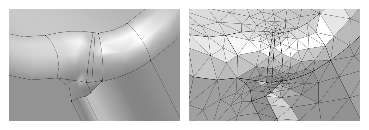 A CAD geometry and the resulting mesh before removing details. A CAD geometry containing short edges, small faces, and sliver faces (left) results in the corresponding mesh (right). A CAD geometry containing short edges, small faces, and sliver faces (left) results in the corresponding mesh (right).