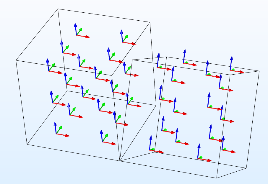 Two domains with different orientations are connected. The local coordinate system for each domain can be aligned to the respective geometry's orientation and position by using the System from Geometry feature from a Face parallel work plane.