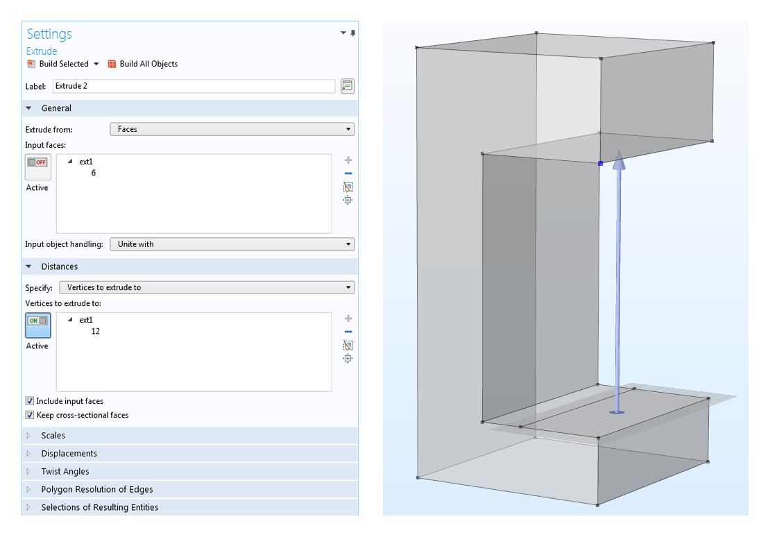 The Extrude Settings window (left), where an input face is allowed to extrude to a specified vertex. The Graphics window (right) shows the extrusion distance using an arrow.