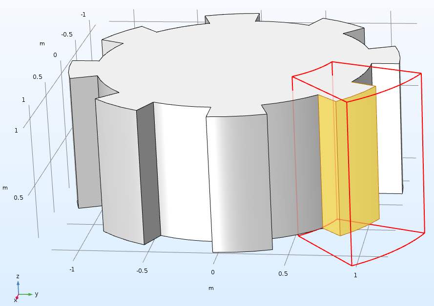 Useful in complicated arrays with many components, new settings allow for easier selections of entities, such as boundaries, which can then be used for further operations. In 3D, you can select sections of a geometry by surrounding them with parts of a cylinder. The Cylinder selection operation in 3D, which can be found under the Geometry and Definitions nodes, now allows for the definition of an inner and outer radius as well as an angle that the Cylinder selection would sweep through. This describes a sector that can capture a selection of entities within the overall object. Similar operations can be performed in 2D using the Disk selection operation (previously called the Ball selection operation).
