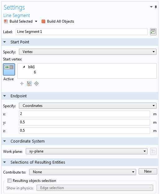 A new geometry primitive for 2D and 3D operations, Line Segment, has been introduced in COMSOL Multiphysics® version 5.3. The start point and the endpoint can be specified either by selecting a vertex or entering coordinates into the Line Segment Settings window.