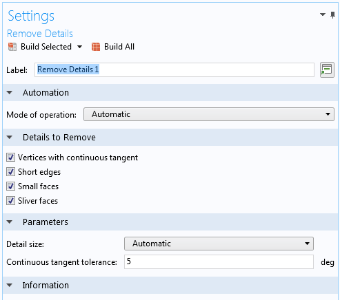 A new 3D geometry operation, Remove Details, has been introduced in order to preprocess your CAD geometries for more successful meshing. This is particularly useful for geometries with small geometric details, which can lead to large meshes of poor quality if they are not handled in a meaningful way.