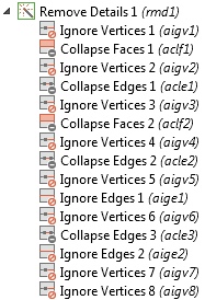 The operation automatically removes short edges and small and sliver (narrow) faces from geometries. The Remove Details operation has two modes: Automatic and Manual. When you remove details in Automatic mode, the operation generates a sequence of virtual operation nodes that you can inspect and edit by switching to Manual mode.