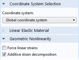 A new framework and more rigorous handling of decomposition into elastic and inelastic deformations has been implemented for cases of geometric nonlinearity. Previous versions of the COMSOL® software used an additive decomposition approach, with a few exceptions such as for large-strain plasticity analyses, which use a multiplicative decomposition approach.