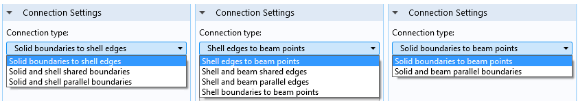 The available connection settings for the (from left to right) Solid-Shell Connection, Shell-Beam Connection, and Solid-Beam Connection couplings.