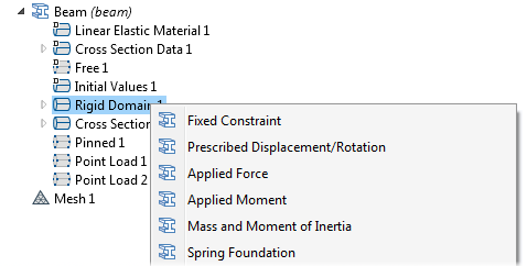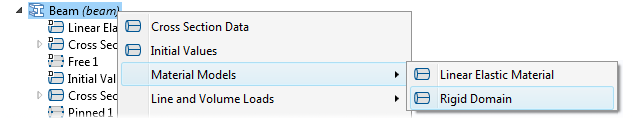 The Rigid Domain material model is accessible from the Shell and Beam interfaces. This is an efficient modeling technique for parts that are significantly stiffer than their surrounding parts, since it only requires the degrees of freedom of a rigid body for an entire set of boundaries (Shell) or edges (Beam). Just as for the corresponding material model in the Solid Mechanics and Multibody Dynamics interfaces, you can apply loads, springs, and inertia at arbitrary locations on the rigid body.