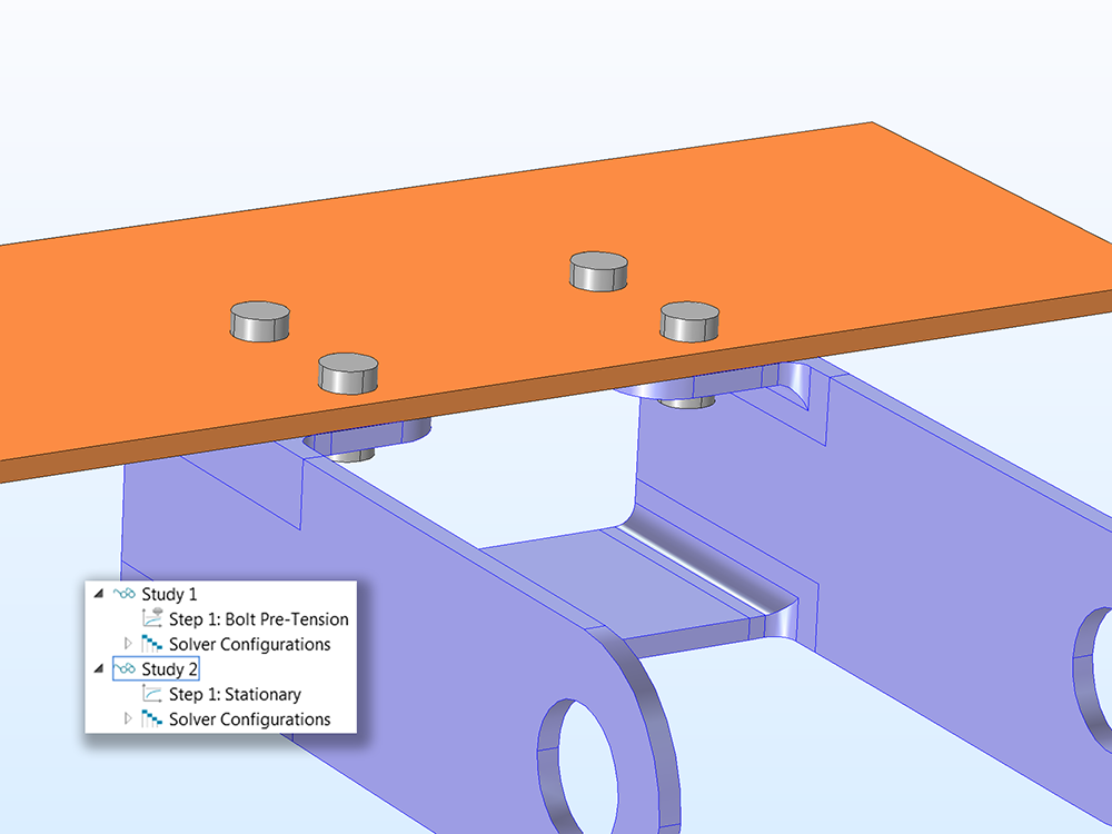 A design consisting of pretensioned bolts holding a bracket. The first Study node contains the new Bolt Pre-Tension study type in the model tree. The second one would then solve for a stationary analysis.