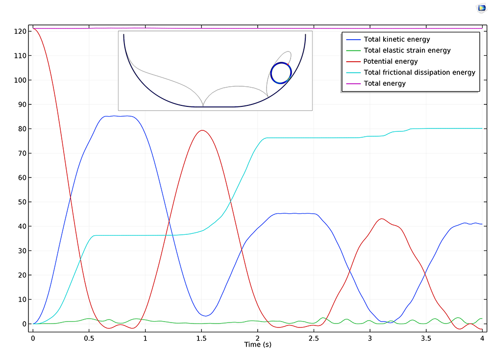 A COMSOL Multiphysics plot depicting the energy balance for a rolling and sliding cylinder. Energy balance for a cylinder rolling and sliding inside a channel due to gravity. Energy balance for a cylinder rolling and sliding inside a channel due to gravity.