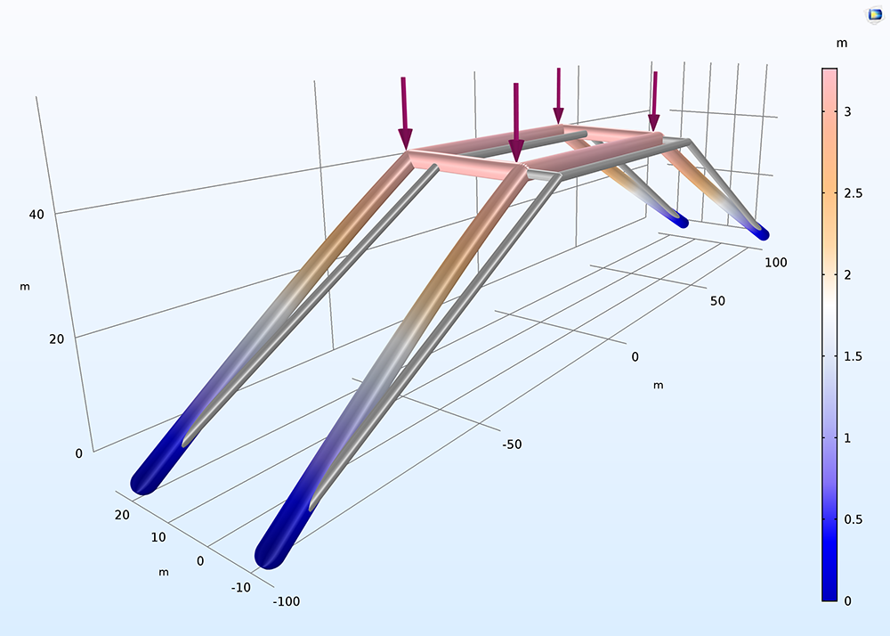 A linear buckling analysis in COMSOL Multiphysics. The buckling shape of a space frame subjected to vertical loads. The buckling shape of a space frame subjected to vertical loads.