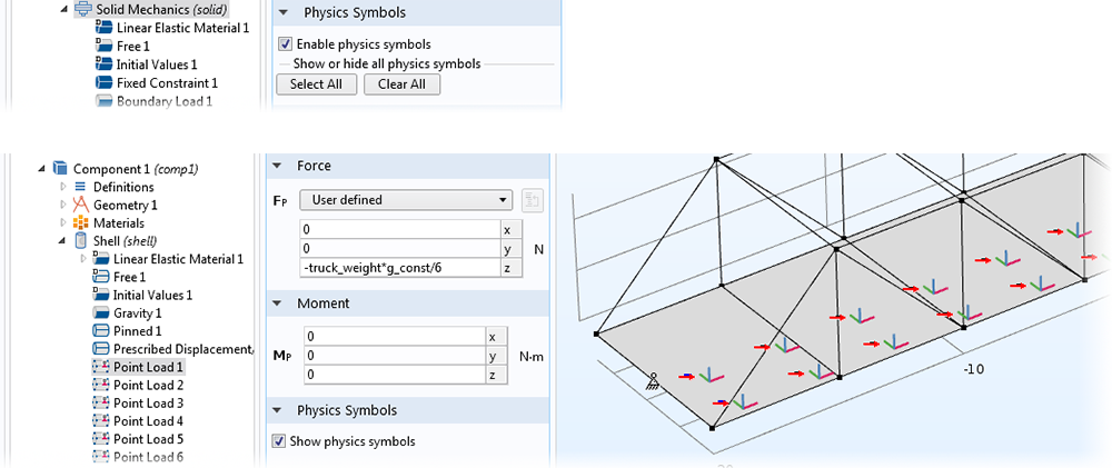 Screenshots showing the Physics Symbols option for Solid Mechanics and for Point Load.