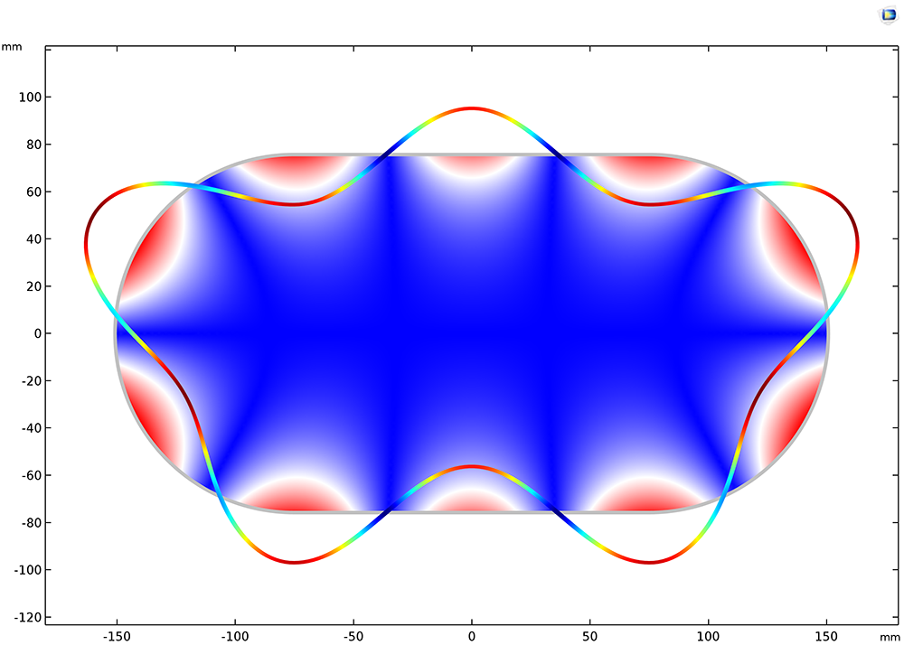 An example of mode analysis in COMSOL Multiphysics version 5.3 Propagation modes in the chamber of a muffler with thin elastic walls. Acoustic pressure and structural deformations are shown. Propagation modes in the chamber of a muffler with thin elastic walls. Acoustic pressure and structural deformations are shown.