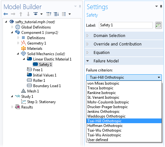 The new Safety attribute to the Linear Elastic Material and Nonlinear Elastic Material nodes enables you to study the use of materials in the structure, particularly with respect to safety factors. The safety factor can be computed with respect to a large number of different isotropic, orthotropic, or anisotropic failure criteria, including user-defined expressions. When a Safety node is included, you can access postprocessing variables for the safety factor, margin of safety, and damage and failure indices.