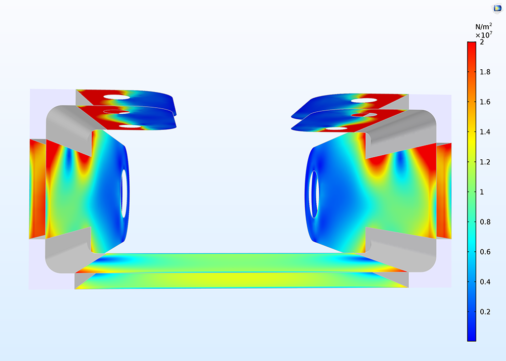 A COMSOL plot of a bracket with stresses on both sides of the shells.