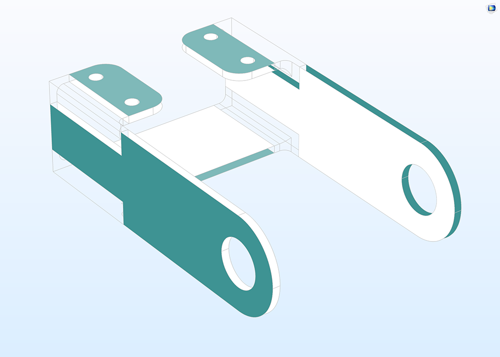 Stress analysis of a bracket where certain parts of the geometry are analyzed using the Shell interface and other parts use the Solid Mechanics interface. When a Shell analysis is used to analyze the shell elements of this geometry, the default plot (shown here) presents the shells as two parallel surfaces separated by the thickness parameter of the shells, with the top surface colored in blue-green, while the parts of the geometry are 3D in nature have been hidden.
