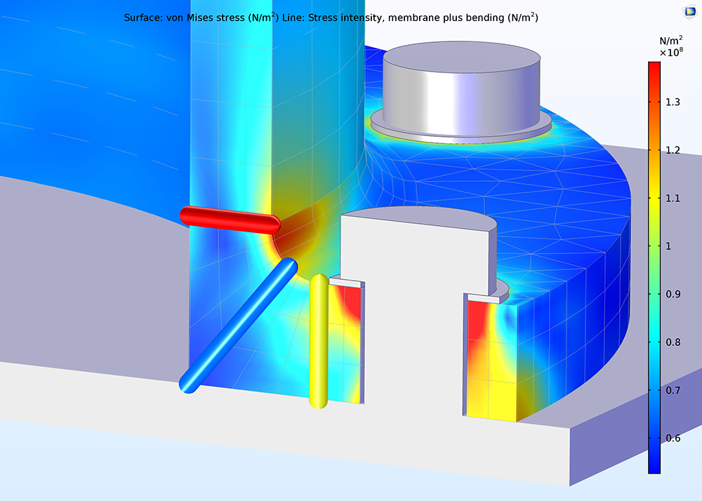 An example of visualizing stress linearization in COMSOL Multiphysics version 5.3 Three stress classification lines after being evaluated using the stress linearization technique. The lines (represented by tubes) on the face of the modeled flange show the maximum stress intensity with values as presented in the color bar. The surface plot depicts the von Mises stresses in the 3D object. Three stress classification lines after being evaluated using the stress linearization technique. The lines (represented by tubes) on the face of the modeled flange show the maximum stress intensity with values as presented in the color bar. The surface plot depicts the von Mises stresses in the 3D object.