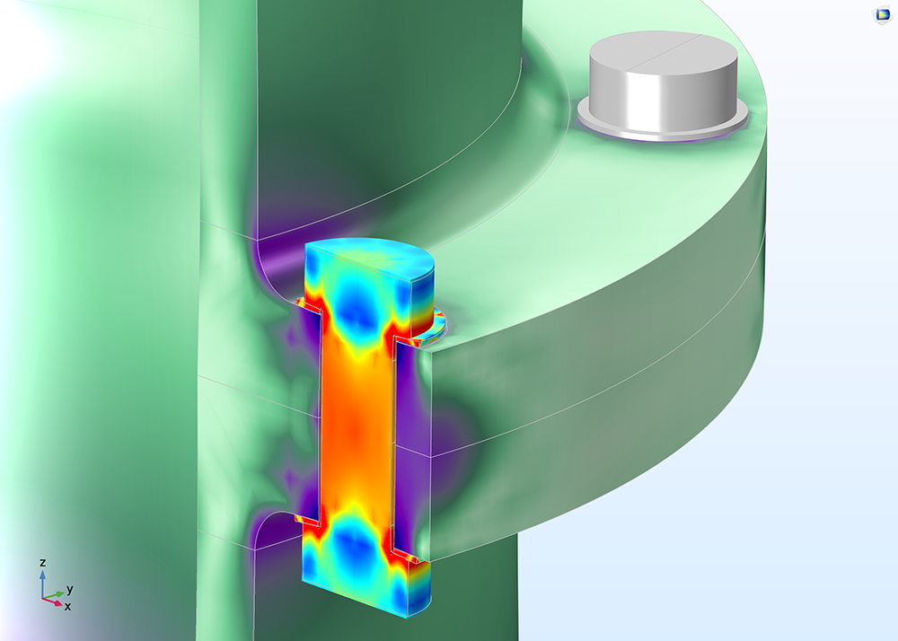 A stress plot of a pretensioned bolt created with the Structural Mechanics Module. Stress plot of a pretensioned bolt that has been cut by a symmetry plane. The cut bolt is detected and treated as if it were a full bolt. This negates having to separately define bolts that have been cut by symmetry planes. All bolts in the model can be specified with the same conditions. Stress plot of a pretensioned bolt that has been cut by a symmetry plane. The cut bolt is detected and treated as if it were a full bolt. This negates having to separately define bolts that have been cut by symmetry planes. All bolts in the model can be specified with the same conditions.