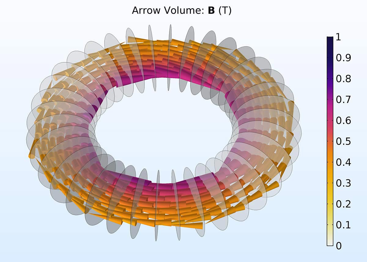 Toroid inductor model with the new Magnetic Scalar Potential Discontinuity feature applied on the gray circular boundaries, equivalent to imposing a line current of 1[kA] along the associated circular edges.