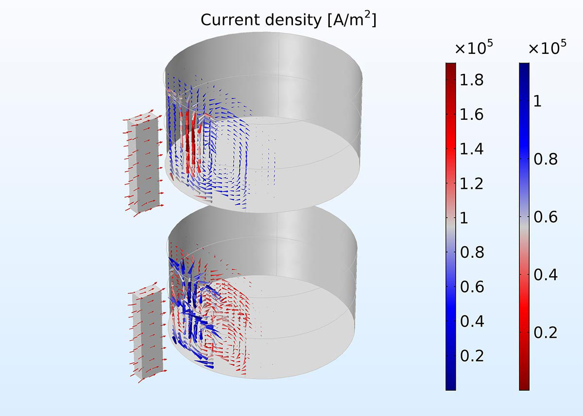 Rotating machinery example where the cylinder rotates around its axis, generating eddy currents from the magnetic field produced by a permanent magnet. The current density is calculated for two situations: without an insulating layer (top image, left legend) and with an insulating layer (bottom image, right legend).