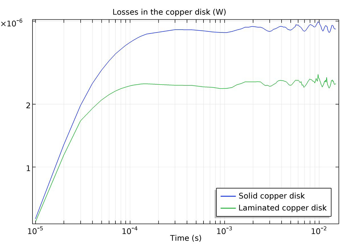 The Rotating Machinery 3D tutorial model has been updated to provide an example of rotor lamination. The rotating cylinder in the model is simulated with and without insulating boundary conditions in the Rotating Machinery, Magnetic interface and the results are compared. When the rotor is laminated, the results show that the eddy current losses are significantly reduced.