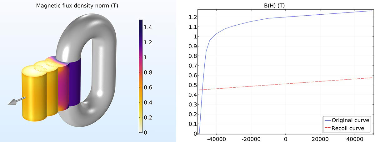 A new material model for modeling soft permanent magnets has been added to the Magnetic Fields; Magnetic Fields, No Currents; and Rotating Machinery, Magnetic interfaces. A generic example material Demagnetizable Nonlinear Permanent Magnet with the approximate properties of AlNiCo 5 has been added to the AC/DC material database to serve as a template for user-defined materials supporting the new material model. Two important permanent magnet materials are AlNiCo (soft magnet) and NdBFe (hard magnet). AlNiCo magnets have an advantage over NdBFe magnets at elevated operating temperatures since the Curie temperature for AlNiCo magnets is in the range 700–860°C as opposed to 310–400°C for NdBFe magnets. For this reason, AlNiCo is sometimes used in permanent magnet (PM) motors where temperatures may be too high for NdBFe magnets. A key design consideration for such motors is that the magnetic flux density in the magnets must never drop below the "knee" of the magnetization curve as that would result in irreversible demagnetization and loss of performance.