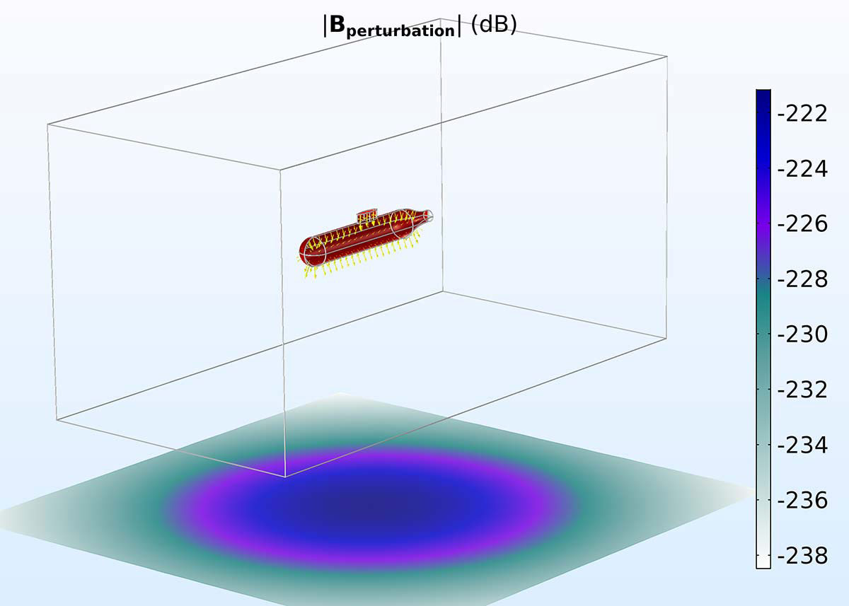 A submarine with its magnetic signature 1 km below it. The box and submarine have been magnified by a factor of 20 in the plot. In this model, the boundary element method is used to model the open space outside the box, whereas the finite element method is used to model the submarine and its immediate vicinity.