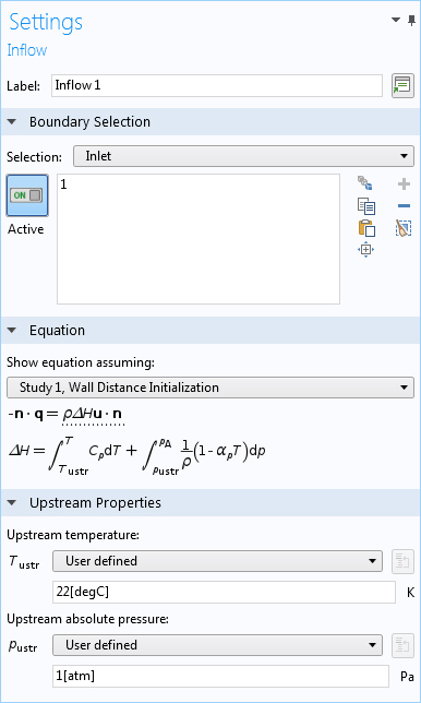 The new Inflow boundary condition applies an inflow of heat coming from a virtual domain, which has been excluded from the model to simplify the analysis, with known upstream conditions. Applied at inlets, where you would previously apply a Temperature boundary condition, the Inflow condition accounts for temperature and pressure from upstream phenomena. Additionally, it does not constrain the temperature at the inlet's adjacent edges (or points in 2D), but instead assigns a heat flux that is consistent with the upstream conditions. Overall, this leads to more accurate and realistic physical models. All the applicable models in the Application Libraries have been updated to take advantage of this boundary condition.