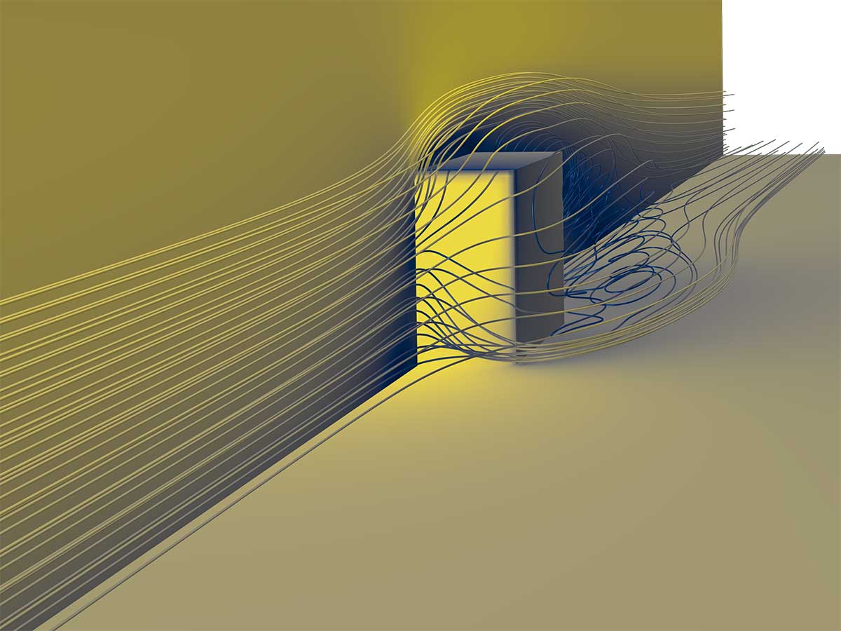 Turbulent flow hitting a cube at a straight angle to one of the faces. The realizable k-ε turbulence model prevents the turbulent energy component in the strain direction from assuming negative values due to rapid mean strain.