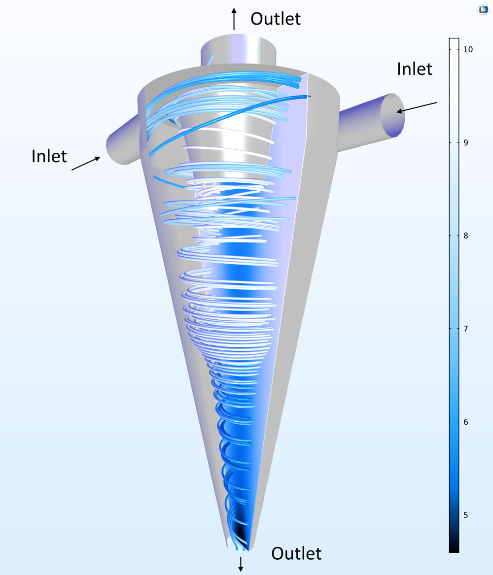 Flow and particle trajectories in a hydrocyclone. The lighter particles are entrained in the flow and follow the main flow upwards to the upper outlet. The heavier particles are expelled radially outwards due to the centrifugal force and exit together with a small fraction of the flow through the lower outlet.