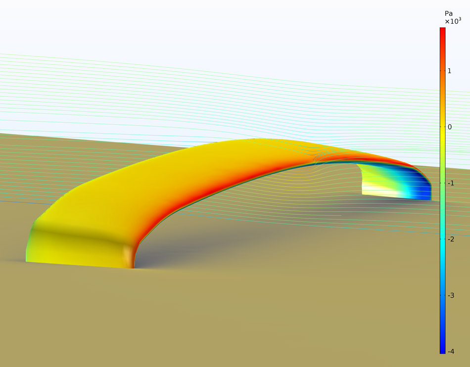 Pressure (color table) and deformation (exaggerated by a factor of 50 at the surface) of a sports car wing subjected to turbulent flow (streamlines) of 200 km/h (125 mph) in a test bench. The model is defined using one-way fluid-structure interaction in the new physics interface.