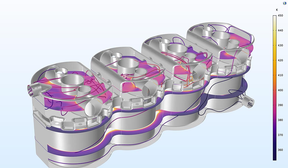 The density, viscosity, heat capacity, and thermal conductivity for the cooling fluid in a four-cylinder combustion engine is calculated with a thermodynamic property package. The fluid flow and the heat transfer analysis is run fully coupled with the thermodynamic and transport property functions.