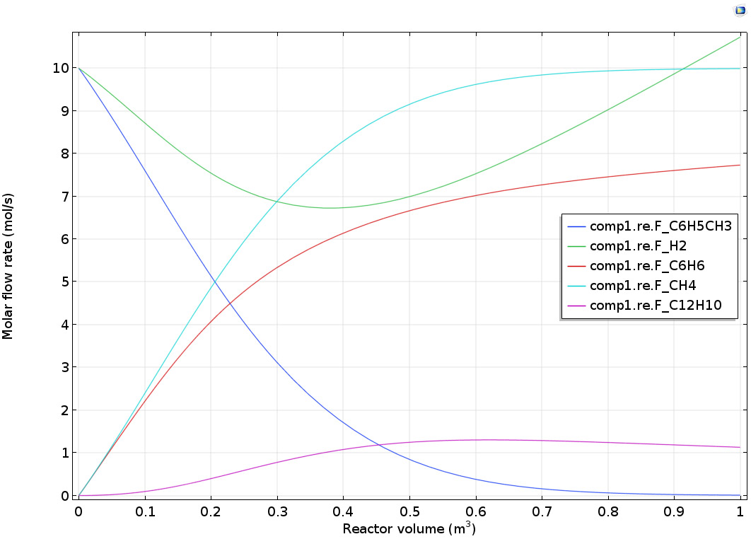 Molar flow rate at the outlet of the membrane reactor as a function of the reactor length for the membrane reactor.Application Library path: