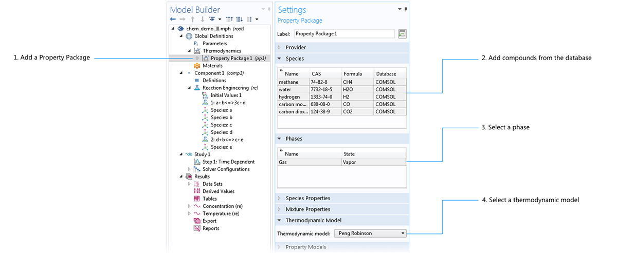 Using a property package significantly increases the modeling capabilities in the Reaction Engineering and Chemistry interfaces. All ideal and nonideal thermodynamic models, for gases and liquids, are directly available and automatically updated by editing the settings for the property package. Furthermore, the Chemistry interface can be used to make the mixture properties readily available in space-dependent models for modeling of mass transport, heat transfer, or fluid flow.