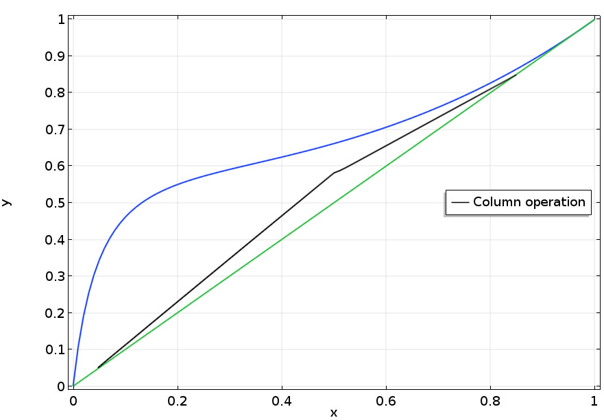 An x-y diagram (phase diagram) showing the calculated operating lines within the distillation column.Application Library path: