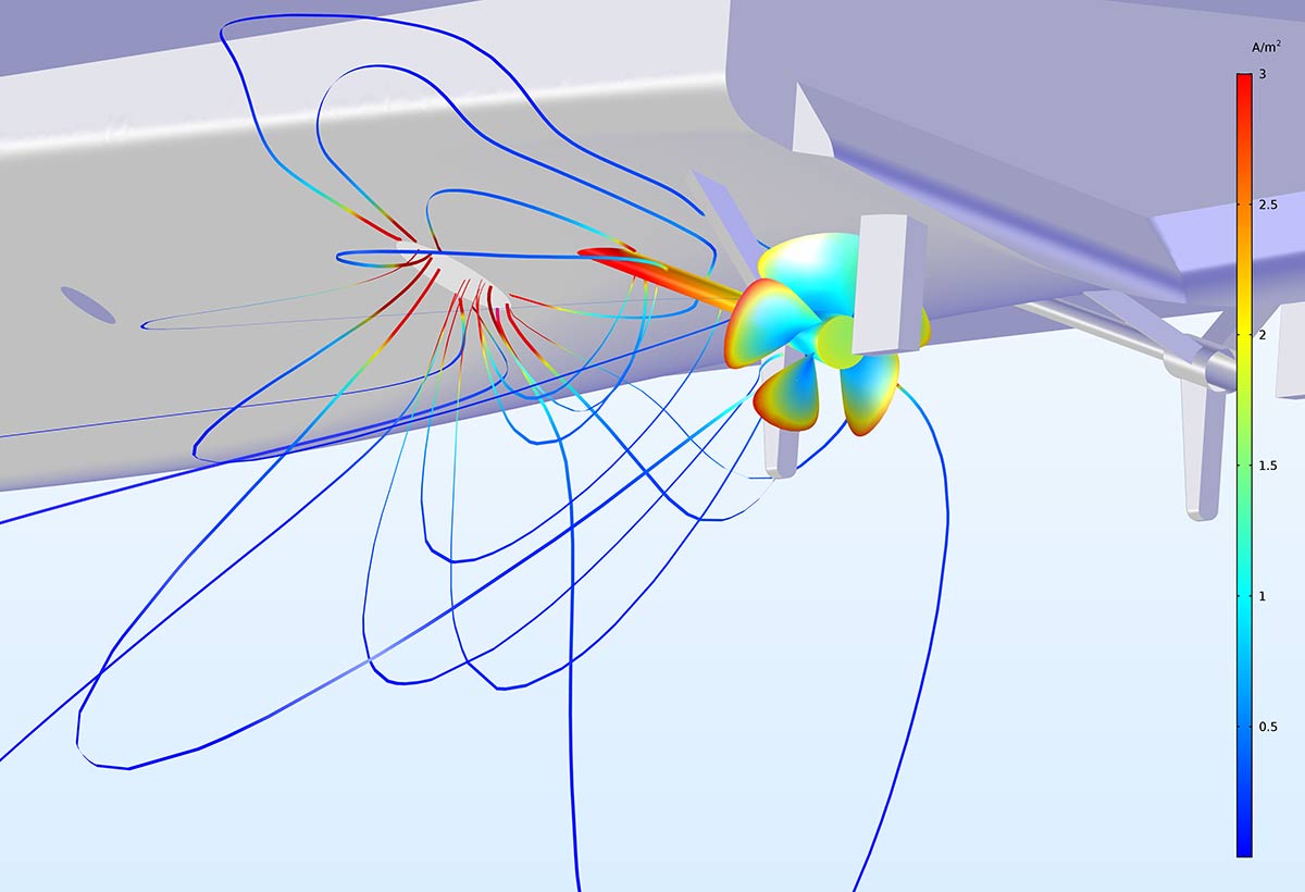 The Ship Hull tutorial modeled with the Thin Electrode Surface feature in COMSOL Multiphysics version 5.3a.