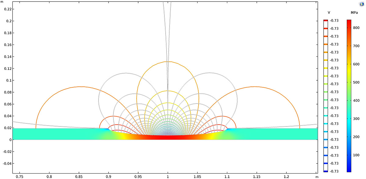 A COMSOL model of stress corrosion in a steel pipe. Stresses in a solid alloy steel pipe and the resulting potential distribution and current streamlines in the adjacent soil, acting as an electrolyte. The higher strains in the thinner part of the pipe results in a higher corrosion rate. Stresses in a solid alloy steel pipe and the resulting potential distribution and current streamlines in the adjacent soil, acting as an electrolyte. The higher strains in the thinner part of the pipe results in a higher corrosion rate.