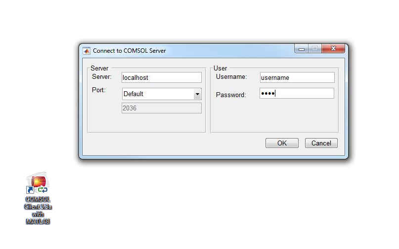 Installed with the COMSOL Client, the shortcut for starting the COMSOL Client with MATLAB® brings up the Connect to COMSOL Server™ window that you can use to establish a connection to COMSOL Server™ and start the COMSOL Client inside MATLAB®.