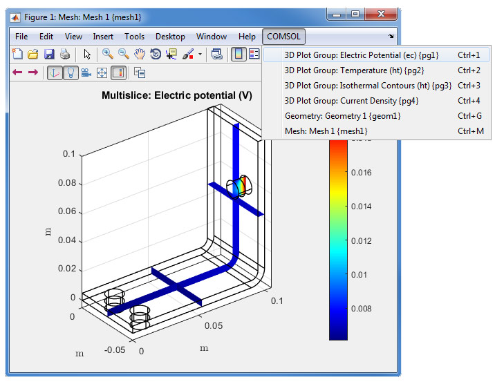 Using mphplot(model) you can now generate a MATLAB® figure window where you can easily switch between geometry, mesh, and result plots in the model, all within the same window. With buttons on the toolbar, you can switch lights on/off and switch between views. The camera positions are also stored when switching between different plots in the figure window.