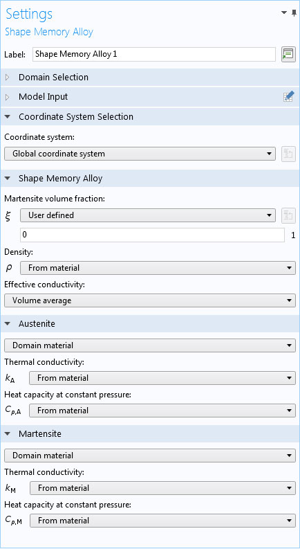 The behavior of shape memory alloys (SMA) is tightly related to temperature, and any structural changes (Austenite ↔ Martensite) will release or absorb energy, changing the thermal properties of the alloys. The Shape Memory Alloy feature in the heat transfer interfaces accounts for the Martensite and Austenite volume fraction. Effective thermal properties are then defined from the thermal properties of each phase. This Shape Memory Alloy feature is designed to be combined with the new Shape Memory Alloy feature included with the Nonlinear Structural Materials Module. To include it in your model, select the Heat transfer in alloys check box in the main Heat Transfer interface node, and the Shape Memory Alloy feature will be available as a Domain boundary condition.