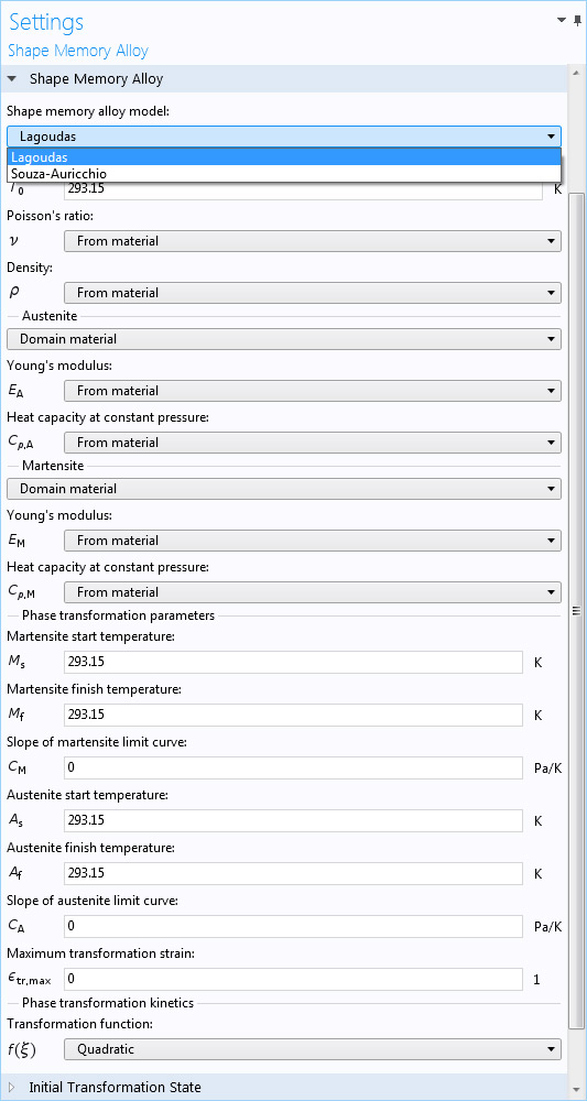 Shape memory alloys are becoming increasingly popular, particularly for medical applications. The mechanical description of shape memory alloys is complex, since the intriguing behavior of these materials is caused by phase transformations, which can be triggered both by mechanical stresses and changes in temperature. The two most common mathematical models for describing shape memory alloys have been added: Lagoudas and Souza-Auricchio. When using either model, you have the ability to define the Austenite and Martensite material properties, as well as phase transformation properties, such as start and finish temperatures. Associated with this is a new interface for heat transfer in shape memory alloys, available in the Heat Transfer Module.