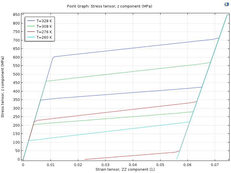 Stress vs. strain for a loading-unloading cycle at different temperatures.Application Library path: