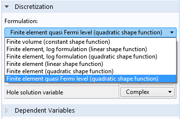 A new discretization scheme has been added using the quasi-Fermi levels as the dependent variables for the charge carriers. The quasi-Fermi level formulation provides an alternative option for tackling the often highly nonlinear equation system when modeling semiconductor devices, for example, at very low temperatures.