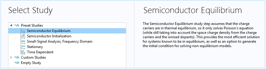 The Model Wizard window showing the new Semiconductor Equilibrium study step.Quasi-Fermi Level Formulation