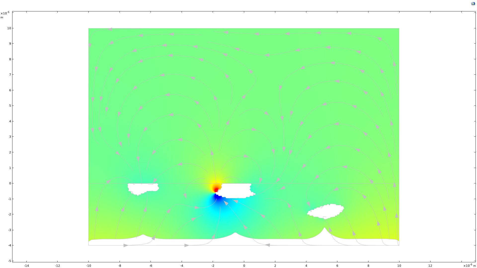 The electrode shape (outer boundaries) and corrosion product deposit (gray area) resulting from a galvanic corrosion process, shown together with the current density streamlines and electrolyte potentials.