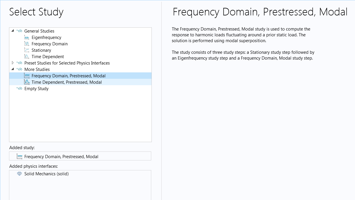 Two new predefined study sequences for modal superposition have been added: Time Dependent, Prestressed, Modal and Frequency Domain, Prestressed, Modal. In both cases, three study steps are generated. The first one is a stationary step in which the prestress state used for the subsequent eigenfrequency computation is determined. Using these studies, it will be significantly easier to analyze prestressed structures with efficient modal superposition methods. Accordingly, some of the previous study types for dynamic analysis were renamed.